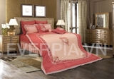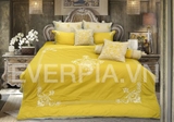 Hoa hồng kem là biểu tượng của tình yêu hạnh phúc mãi mãi được thêu trên nền màu hồng cam đem lại cho đôi uyên ương sự lãng mạn, nhẹ nhàng kết hợp với màu hồng nhạt mang lại sự trẻ trung cho căn phòng .