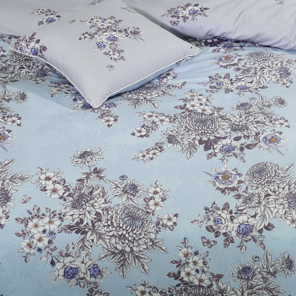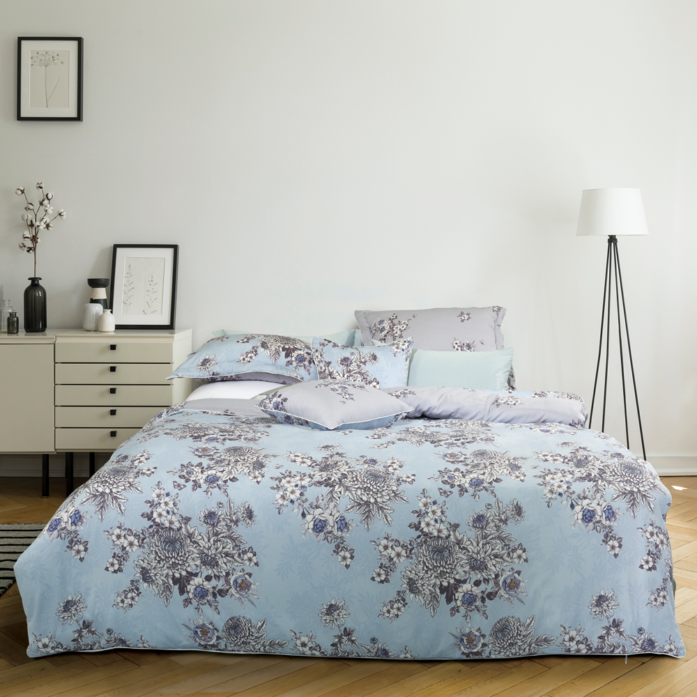 Bộ chăn ga EPM22064 được thiết kế với những nét vẽ họa tiết cụm hoa to bản tinh tế, trải đều khắp mặt vải tone xanh nhạt rất nhẹ nhàng và trang nhã. Điểm xuyết trên nền vải xám nhạt phía mặt trong là những chùm hoa nhỏ xinh xắn, tô điểm thêm cho bộ chăn ga.