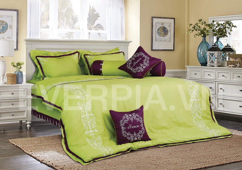 Bộ chăn ga gối Everon Es1603 mẫu mới nhất năm 2016. Bộ sản phẩm có gam màu chủ đạo là màu xanh nõn chuối họa tiết thêu là những đường chỉ trắng nổi bật. Các đường viền cách điệu là vải màu tím. Bộ chăn ga gối Everon Es 1603 sẽ đem đến căn phòng bạn nét tự nhiên tuơi sáng.