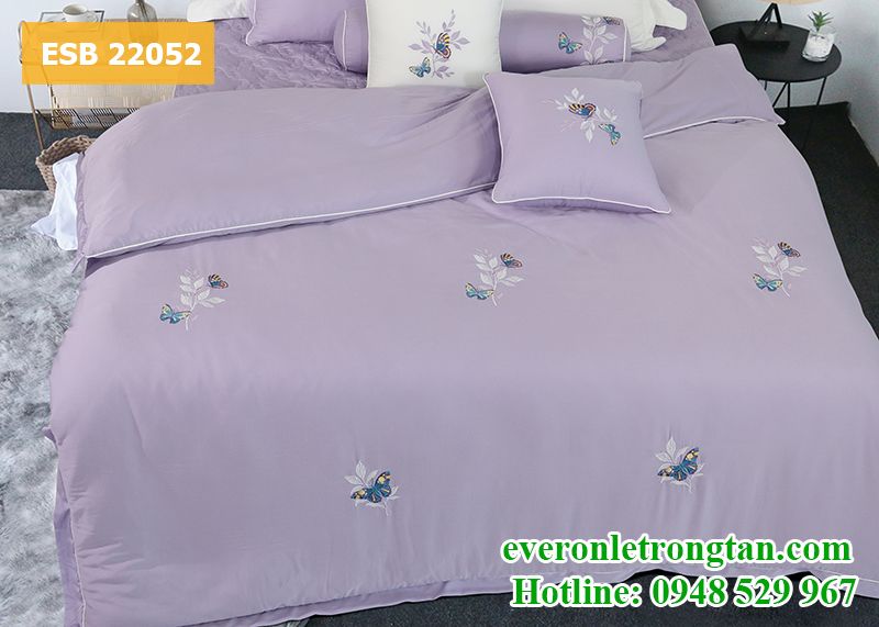 ESB22052 mang đến một không gian mới mẻ, đầy cảm hứng với gam màu tím nhạt trẻ trung, hiện đại. Màu tím tượng trưng cho sự thủy chung, tình cảm gắn bó giống như con bướm và nhành hoa – họa tiết chủ đạo của bộ chăn ga. Họa tiết sinh động được thêu tỉ mỉ, điểm xuyết thêm những đường thêu ren điệu đà càng khiến bộ chăn ga trở nên tinh tế hơn bao giờ hết. Chất liệu vải Bamboo mềm mượt tôn thêm vẻ đẹp của những chú bướm màu sắc và cành hoa mỏng manh bay bay trong gió. Tất cả sự kết nối tạo nên một tổng thể hài hòa vô cùng.