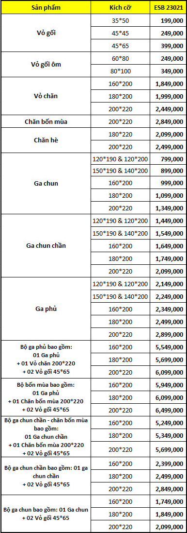Bộ chăn ga gối Everon ESB 23021 gồm đa dạng sản phẩm với nhiều kích thước khác nhau, giúp khách hàng có thể thoải mái lựa chọn. Nếu bạn cho rằng, Everon ESB 23021 là bộ chăn ga gối mà minh đang tìm kiếm, vui lòng liên hệ với chúng tôi để được tư vấn và nhận báo giá chi tiết.