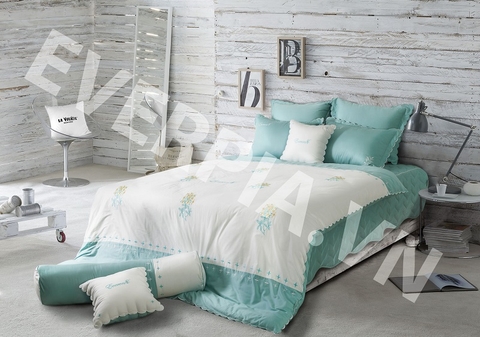 Bởi vậy nhà thiết kế đã đưa vào sản phẩm chăn ga một màu xanh tươi mát, mang đến cho căn phòng bạn một không gian yên bình và tươi mới. Kết hợp với họa tiết thêu giả ren màu xanh cốm non đem đ...
