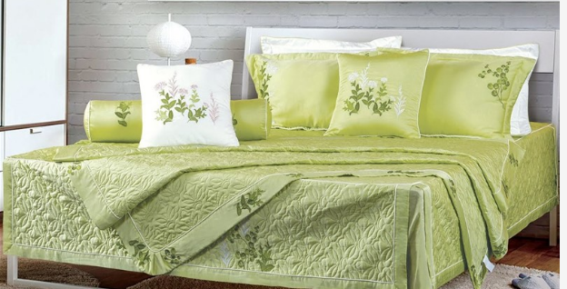 - Màu xanh tươi sáng, nhẹ nhàng với những chiếc lá được thêu tinh tế trên mặt chăn, mặt gối giúp cho không gian phòng ngủ luôn được thư thái, nhẹ nhàng.