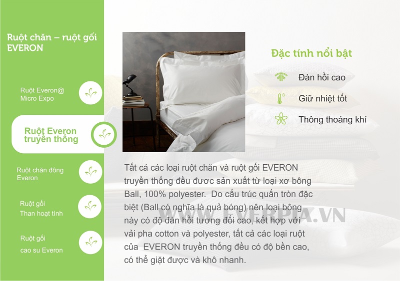 Cácloại ruột gối Everon truyền thống đều được sản xuất từ loại xơ bôgn Ball, 100% Polyester. Do cấu trúc quấn tròn đặc biệt nên loại bông này có độ đàn hồi tương đối cao, kết hợp với vải pha cotton và polyester, các loại ruột gối Everon truyền thống có độ bền cực cao, có thể giặt được và khô nhanh.