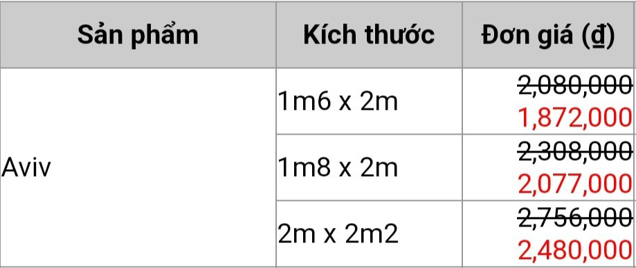 BẢNG GIÁ ĐỆM MỚI 2023